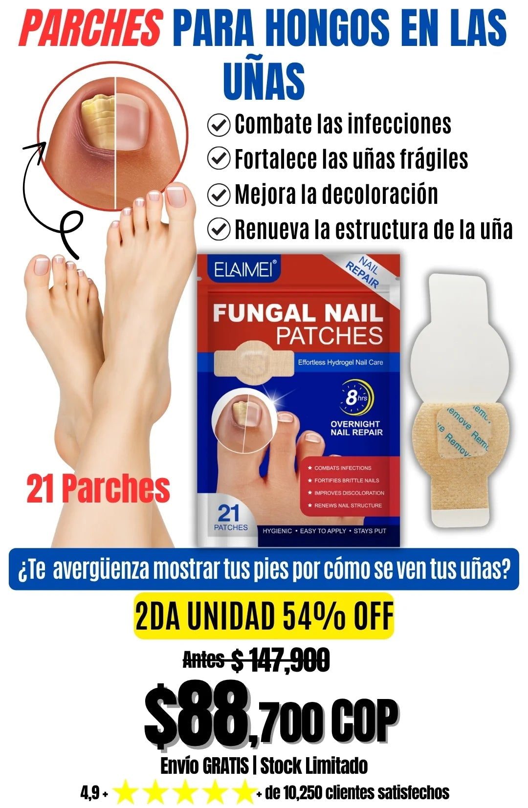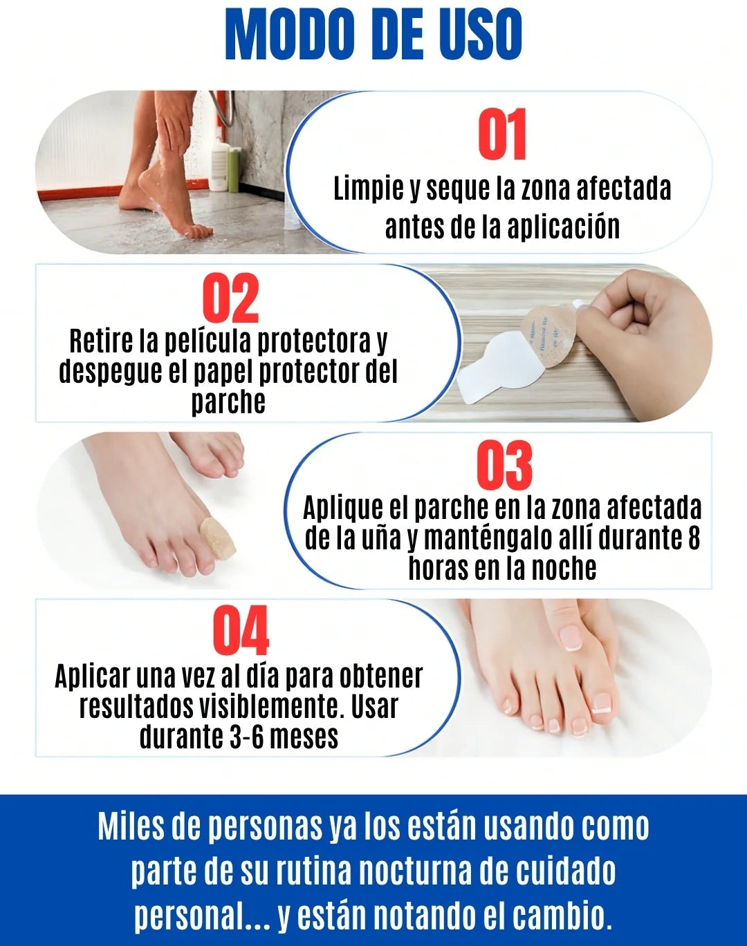 Sí, los parches funcionan tanto para uñas de los pies como de las manos. Solo asegúrate de que la uña esté limpia antes de aplicarlo.