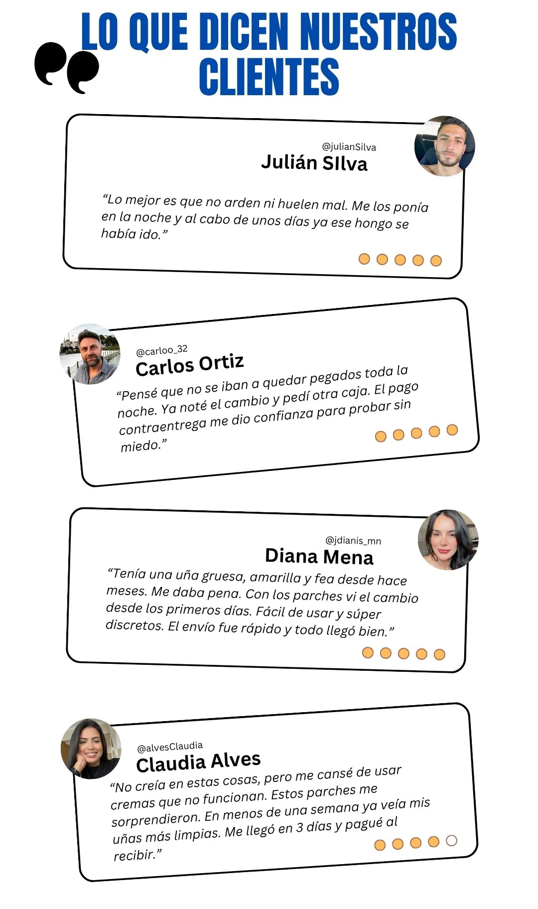 Muchos clientes con casos visibles han notado mejoras en el aspecto de sus uñas usando los parches de forma constante. Si el daño es severo o hay dolor, recomendamos complementar con evaluación médica.