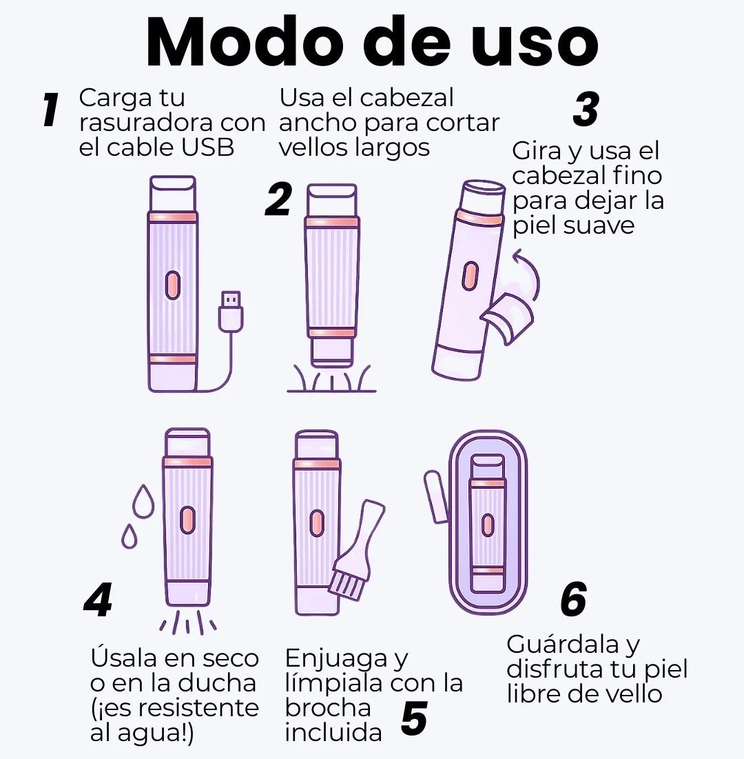 Tu compra incluye la rasuradora®, cable de carga tipo C, brocha de limpieza y manual de uso. Todo listo para usar desde el primer día.