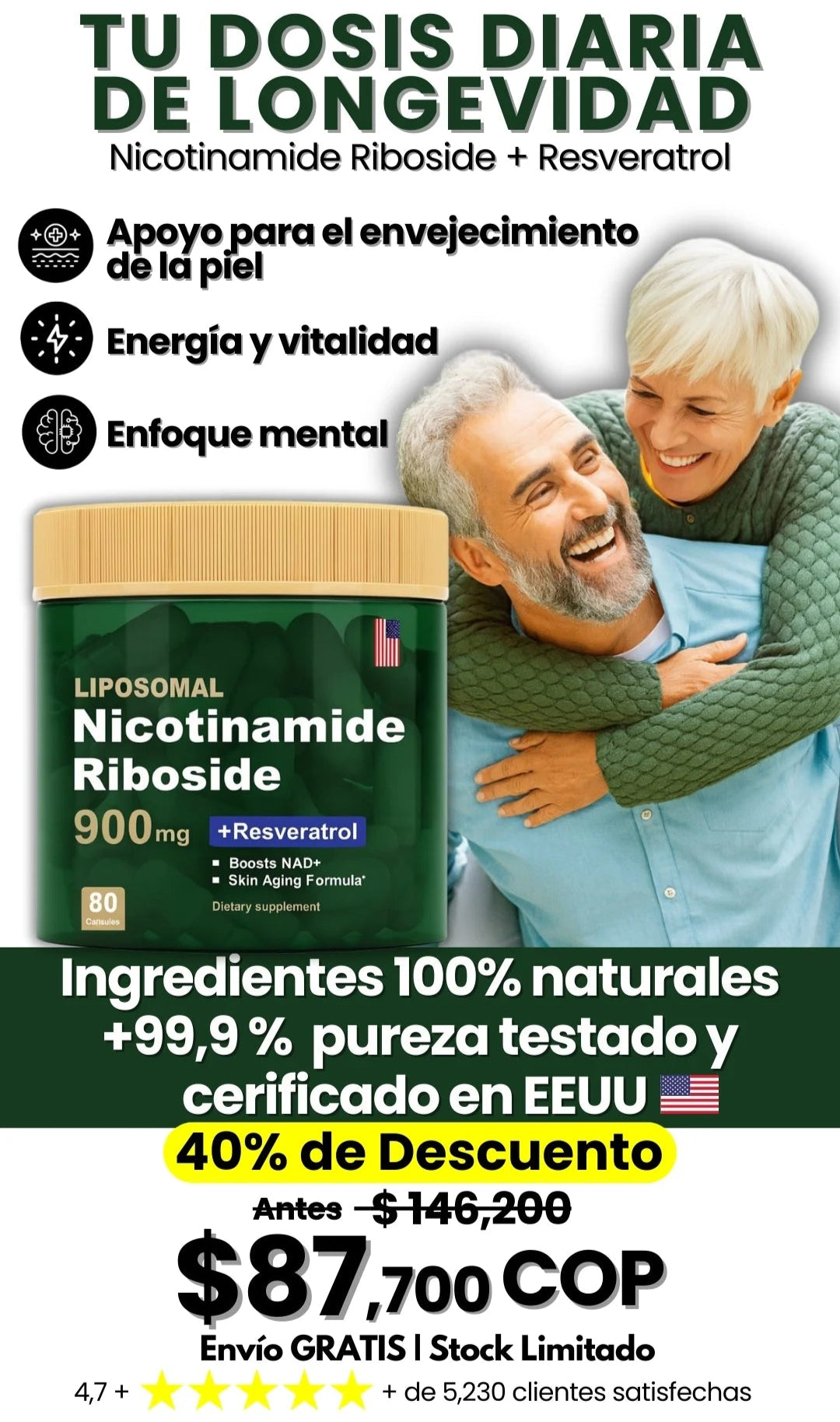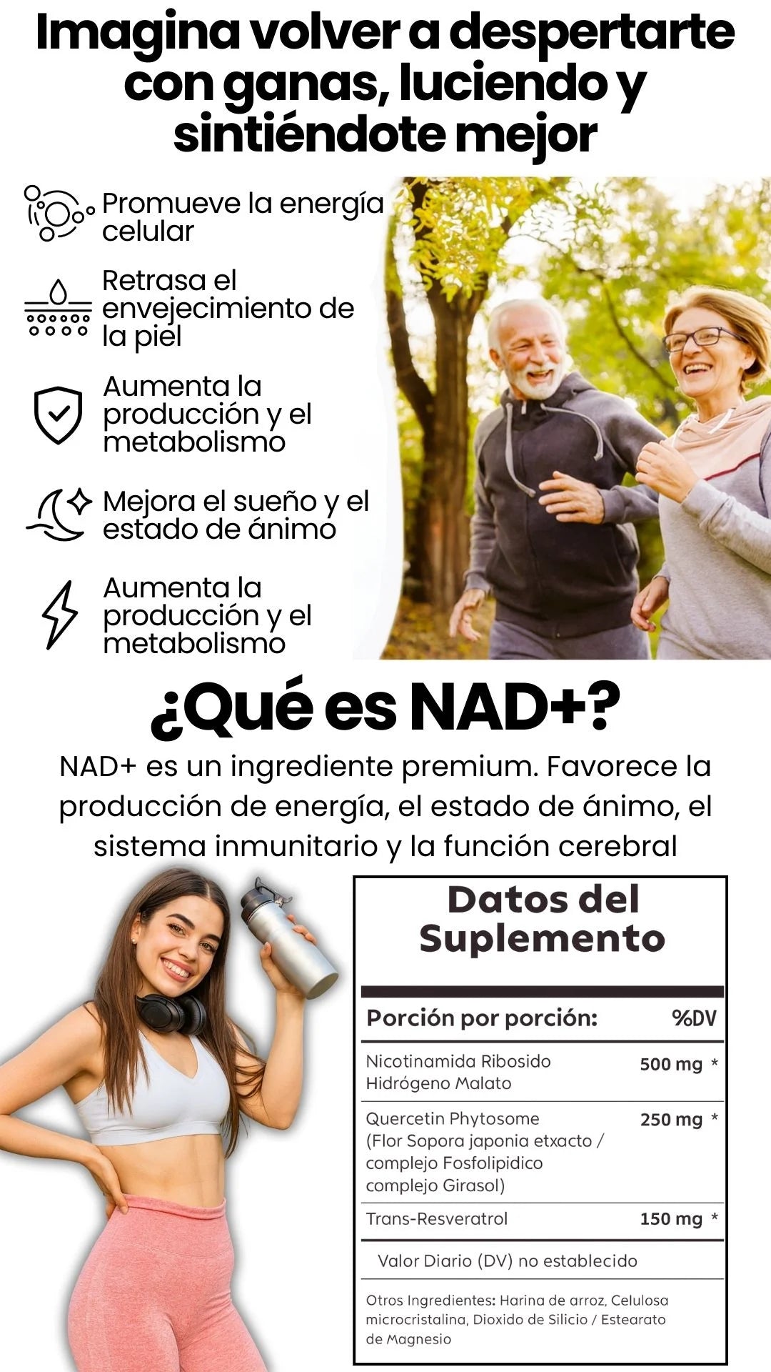 Al aumentar los niveles de NAD+ alimenta la energía celular y mejora la eficiencia metabólica. Este metabolismo optimizado puede ser un poderoso aliado en su camino hacia la pérdida de peso, especialmente cuando se combina con un estilo de vida activo y una nutrición saludable.¡Experimente una transformación desde adentro y deje que este complejo natural apoye sus objetivos corporales!