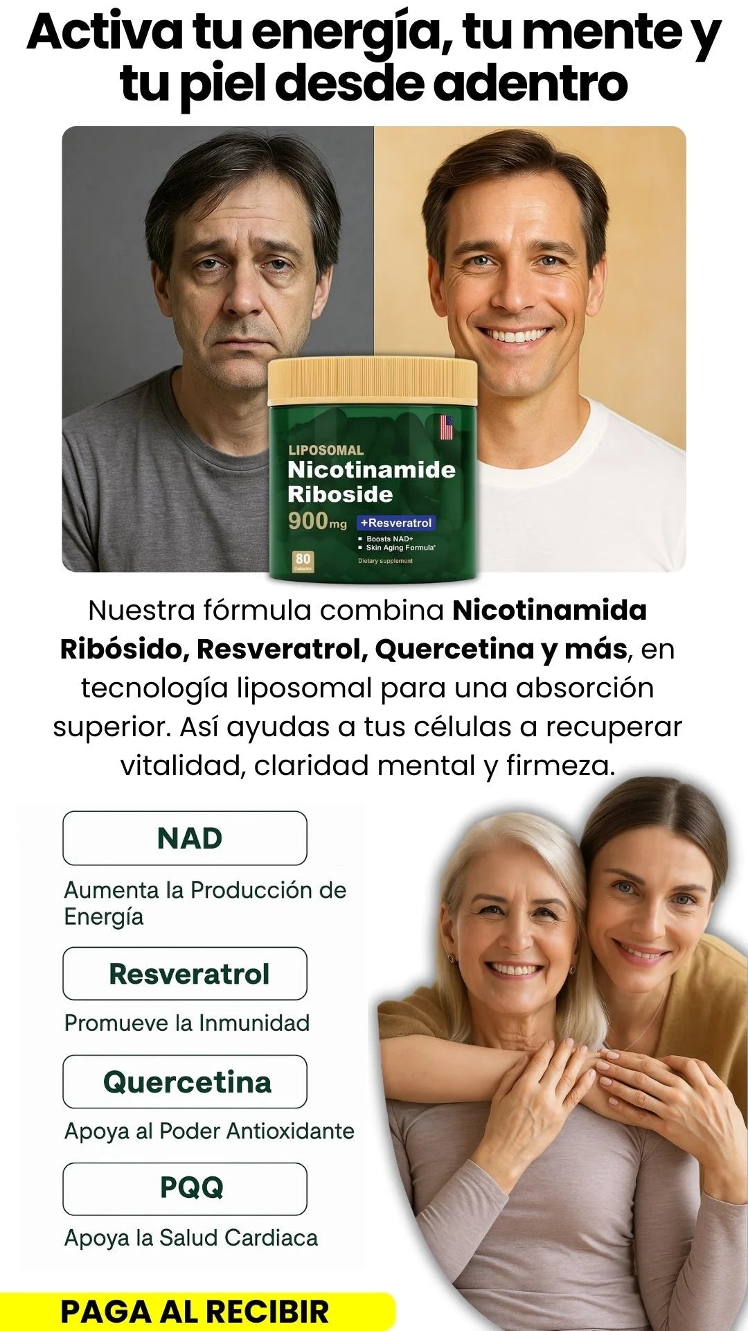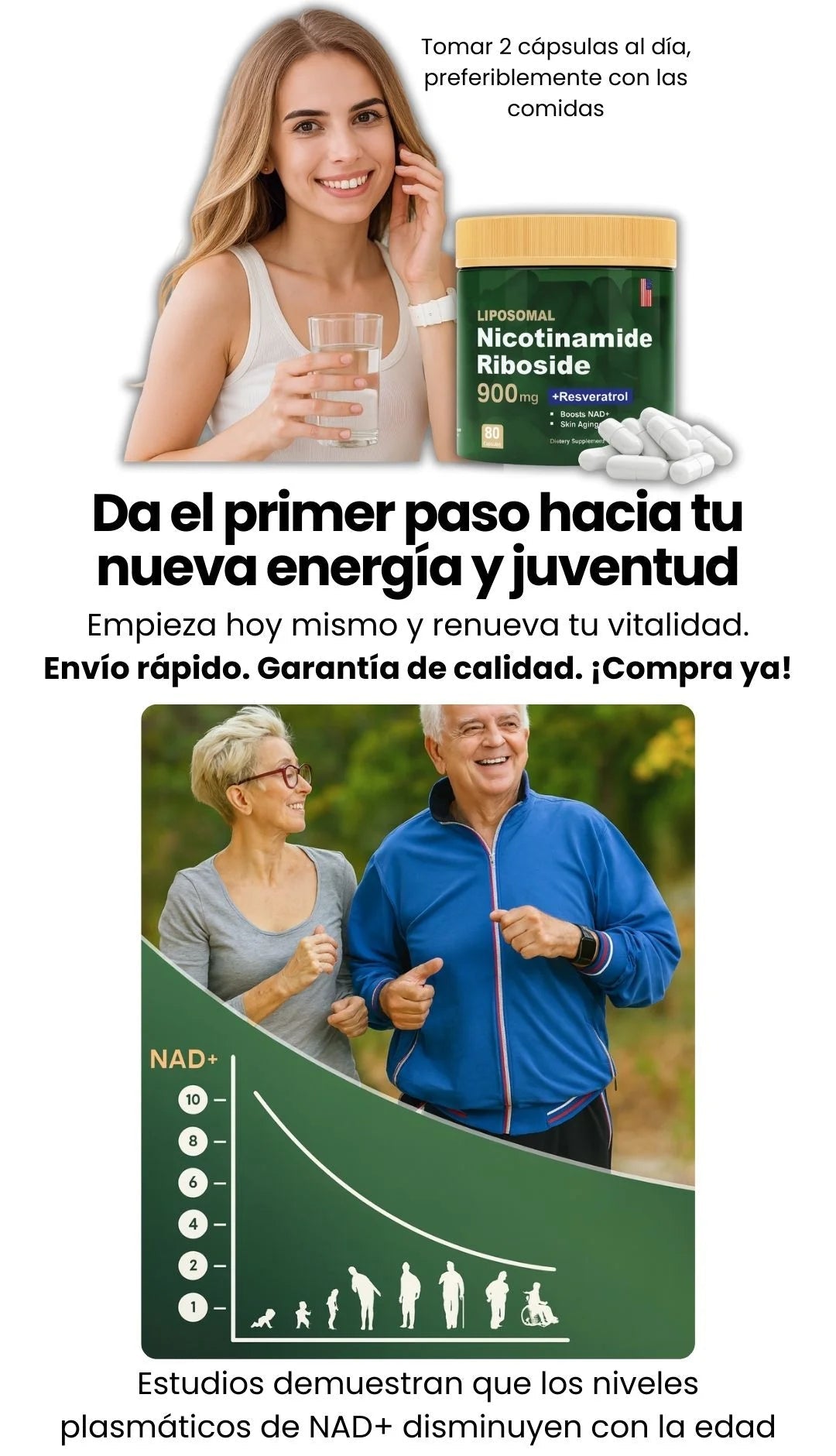 A medida que envejecemos, nuestros niveles de NAD+ disminuyen naturalmente, lo que puede provocar una reducción de la energía y signos visibles del envejecimiento. Nuestra fórmula ayuda a aumentar los niveles de NAD+, lo que favorece un envejecimiento saludable y un aumento de la energía.